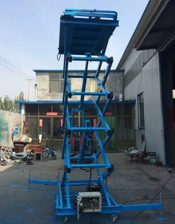 移動剪叉式升降平臺主要技術特點:臺面鋼板折彎、底架及剪叉結構山鋼定做高強度矩形管材; 標準冷彎槽做道軌,使用尼龍滑塊做導軌輪,接觸面大,升降平穩,晃動??;液壓油缸 內置防爆閥(防止油管斷裂,平臺失速下降),采用進口密封圈,經久耐用,不泄露;雙層鋼網高壓油管;升降機專用液壓泵站,加裝應急下降閥,平臺斷電可手動控制 下降,內置溢流閥,可防止上行運動時系統壓力過高,起到超載保護功能;充氣橡膠輪胎;電路電器、接觸器羅列連接,加裝熱過載保護,缺相保護等安全保護功能;電動上、下電動控制,控制按鈕盒加裝急停按鈕,以最大限度保障財產及人身安全,各操作部分使用24V安全控制電壓;軸銷圓鋼配做,調質處理;拋丸、噴砂 除銹處理,除去鋼結構構件表面的銹蝕及焊接飛濺,能使鋼構件表面產生一定程度的凹凸不平的效果,增大粉末的附著力;使用靜電粉末噴涂;涂層外觀質量優異,附著力及機械強度強,色澤亮度高,經久不褪色。